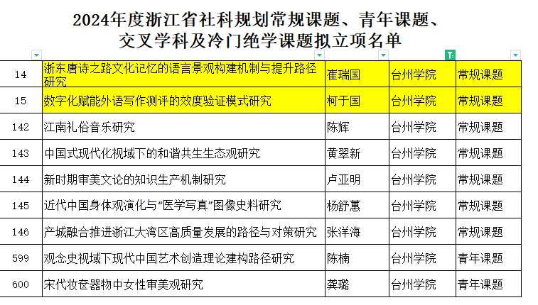 近日,根据《浙江省哲学社会科学规划课题管理办法》, 经专家评审、浙江省哲学社会科学工作办公室审批,2024年度浙江省哲学社会科学规划常规课题、青年课题、交叉学科及冷门“绝学”课题拟立项名单予以公示。台州学院共有9个项目获得立项,我院喜获2项常规项目的立项,分别是崔瑞国博士主持的 《浙东唐诗之路文化记忆的语言景观构建机制与提升路径研究》和柯于国博士主持的 《数字化赋能外语写作测评的效度验证模式研究》。