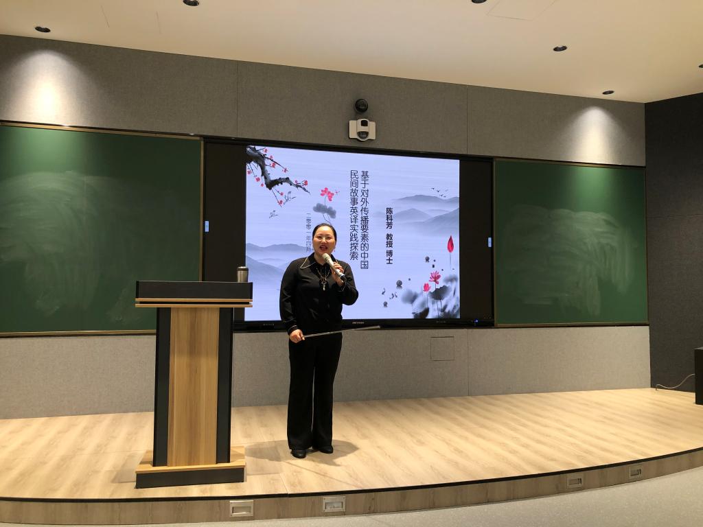 在《基于对外传播要素的民间故事英译实践探索》专题讲座上,陈教授结合本科阶段翻译教学情况,以一则西湖民间故事的英译为例,从对外传播的五要素(信息源、传播者、受传者、讯息、媒介)出发,描述译前-译中-译后的翻译过程,探索有效译介规律和策略,建构多模态多功能数字人文传播途径,帮助学生提高对翻译的认识,提升翻译实践能力。讲座结束后,与会师生与陈教授进行了进一步的交流。