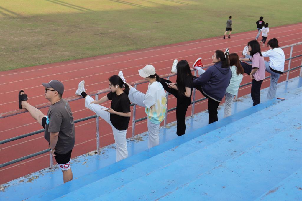 正式训练开始前,刘国顺和汪钰皓带领同学们进行了正踢腿、侧踢腿、高抬腿、慢跑等热身运动,以此来活动肢体、调整同学们的运动状态。训练过程中,刘国顺和汪钰皓先测试了同学们的跳远成绩。随后,刘国顺为女生简要地讲解了跳远的动作要领,男生则跟随汪钰皓进行了引体向上的训练。最后,同学们有序地完成了五十米短跑测试。