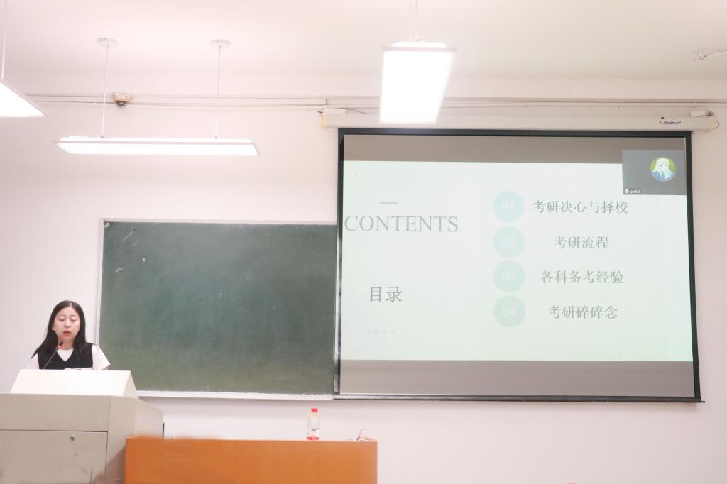 陈明洋则通过线上直播的方式讲解了初试与复试的细则与题型,希望同学们注重语言学、英美文学、日语、基础英语的日常练习与积累。在此过程中,她还分享了《蓝宝石N3》这一课外补充资料与“胡萍”、“hero”等网课素材,鼓励同学们利用网络社交平台来完善复习体系。