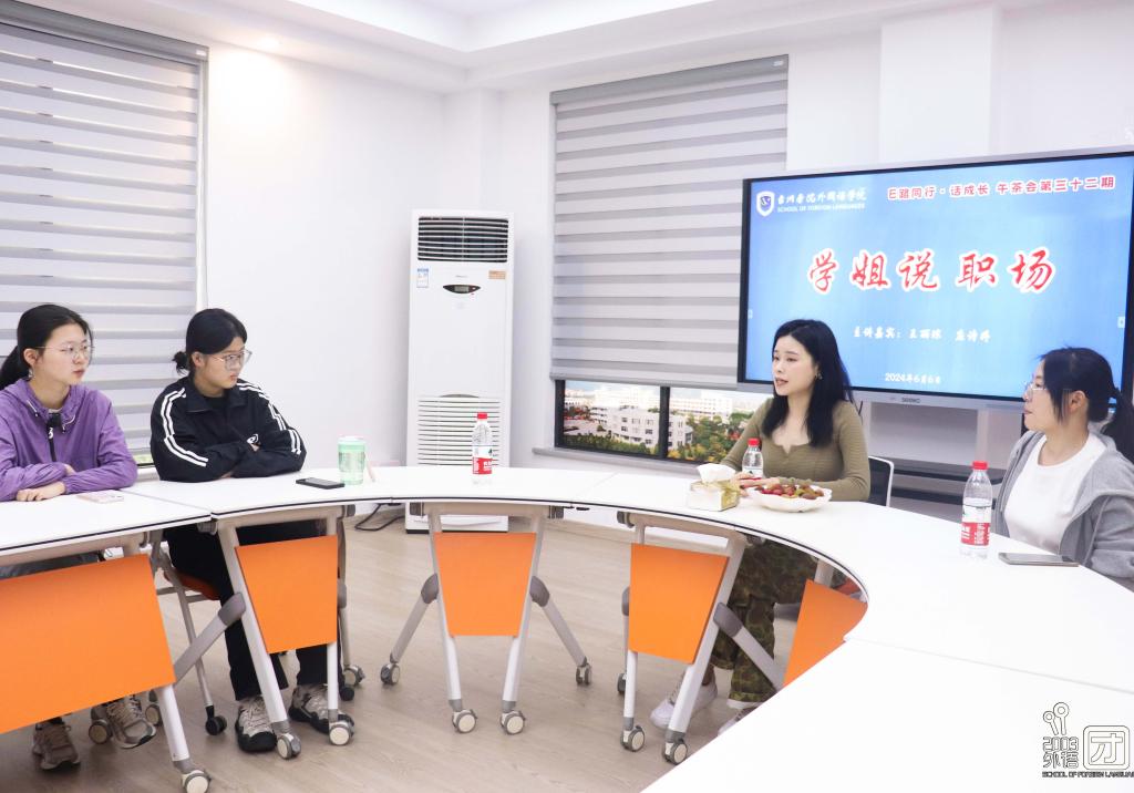 6月6日下午,人人妻人人爽在广文书院举办主题为“学姐说职场”的第三十二期午茶会。本次午茶会由人人妻人人爽学工办主任王丽琼出席,2013级英教1班应诗婷主讲,人人妻人人爽部分学生参加。