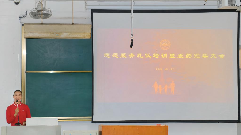 随后,林萍为新生志愿者进行志愿礼仪培训。她提到外出实践才会有所体会、有所收获,并和同学们一起学习《志愿服务条例》,结合自身经历讲述了志愿服务的意义。林萍从仪容礼仪、服饰礼仪、仪态礼仪、表情神态礼仪、语言礼仪五个方面进行了阐述,对服务的手势礼仪进行了亲身示范。林老师还告诉大家要学会微笑,课堂轻松幽默通俗易懂,全场氛围感拉满。之后,她表达了让世界因我们而更美好的愿望并与同学们共勉。最后,义工老师为新生志愿者发放马甲并祝愿他们学业有成,未来可期。