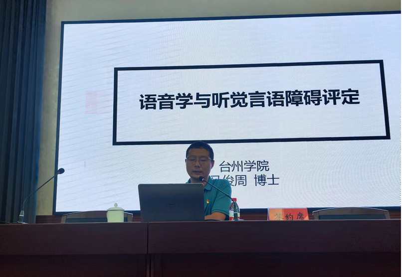 签约仪式结束后,马俊周博士以《语音学与听觉言语障碍评定》为题,为台州市特殊教育学校的老师带来一场精彩纷呈的讲座。