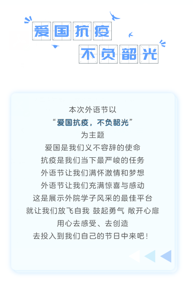 此次外语节的主题是“爱国抗疫,不负韶光”。在抗击疫情的特殊时期,线上活动受到了同学们的欢迎,如习语金句翻译大赛,讲述抗疫英雄的“My hero”英语演讲大赛、最美网课笔记征集等,都是以当代大学生喜闻乐见的表达方式开展活动,让同学们在提升自我外语水平的同时,培养爱国情怀,做到心怀祖国,放眼世界。