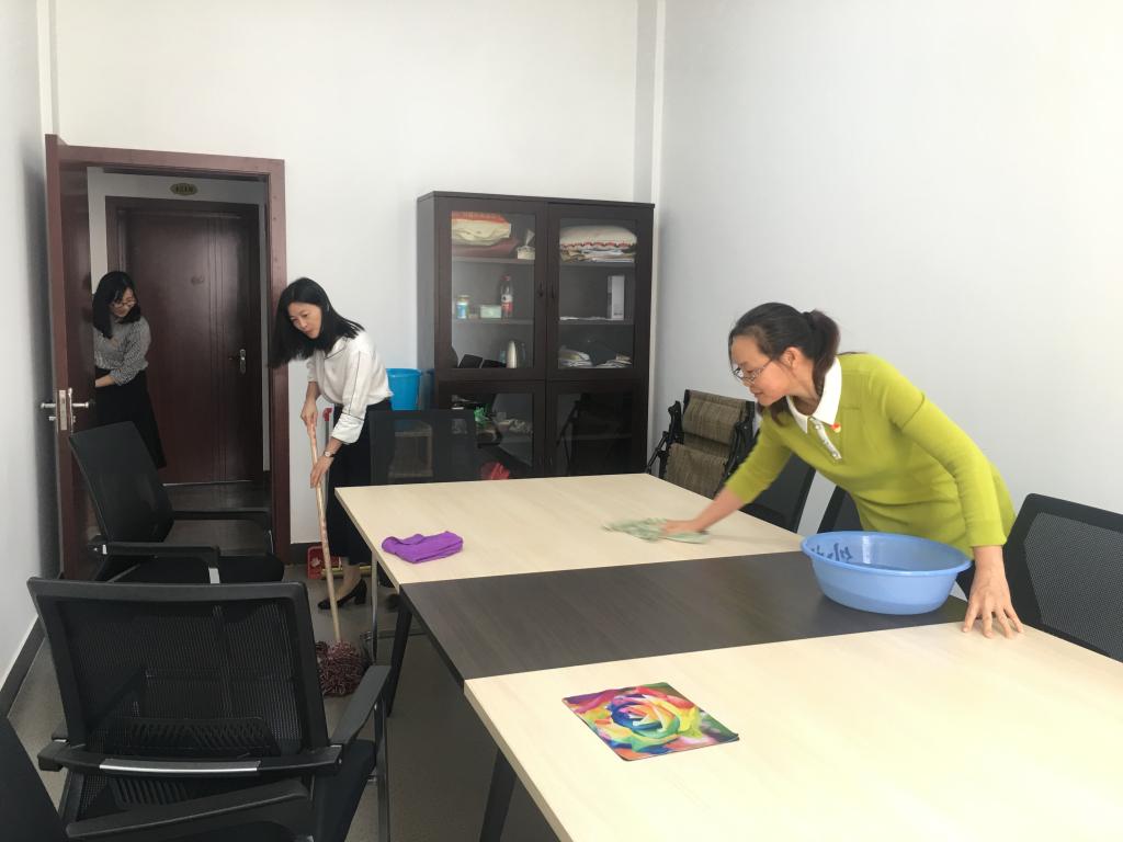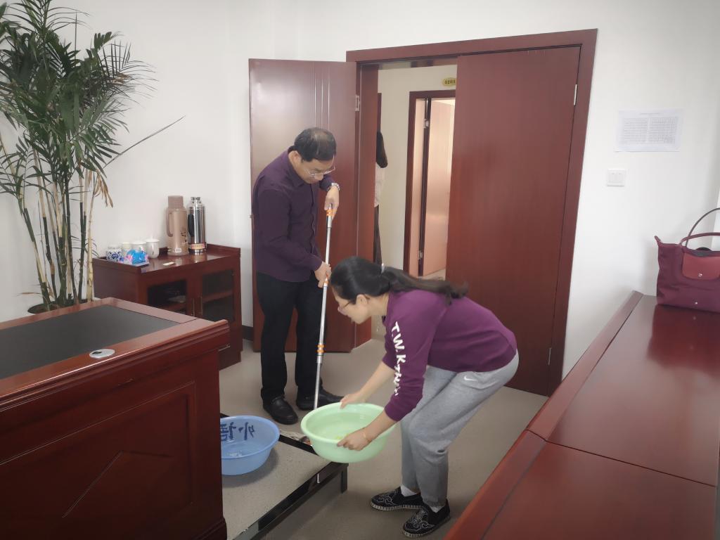 全院师生按支部分为四支队伍,拿取工具,分工打扫4号教学楼。从架空层到办公室区,从公共空间到室内环境,党员同志们积极参与,擦桌子、拖地,齐心协力耐心打扫,展现出了饱满的热情。同志们有的一手持畚箕,一手拿扫帚;有的提水;有的倒垃圾,大家用心打扫每个角落,把学院当成自己的家。四号楼的教室、办公室、架空层变得干净整洁。