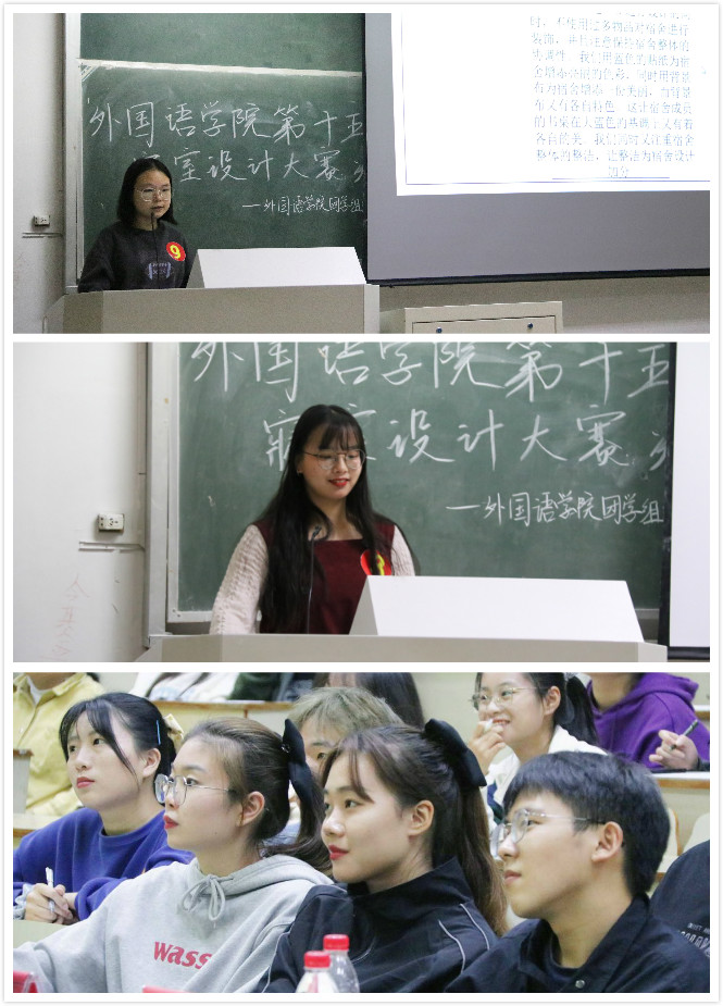 本次比赛分初赛和决赛,共有11个寝室进入决赛。决赛现场,11位寝室代表依次上台向大家分享。她们从寝室标语、寝室口号、寝室精神、寝室风貌等方面向大家详细介绍寝室情况。各参赛寝室细节布置到位,个性突出。接着,老师和大众评委根据评分细则进行打分,评定名次。