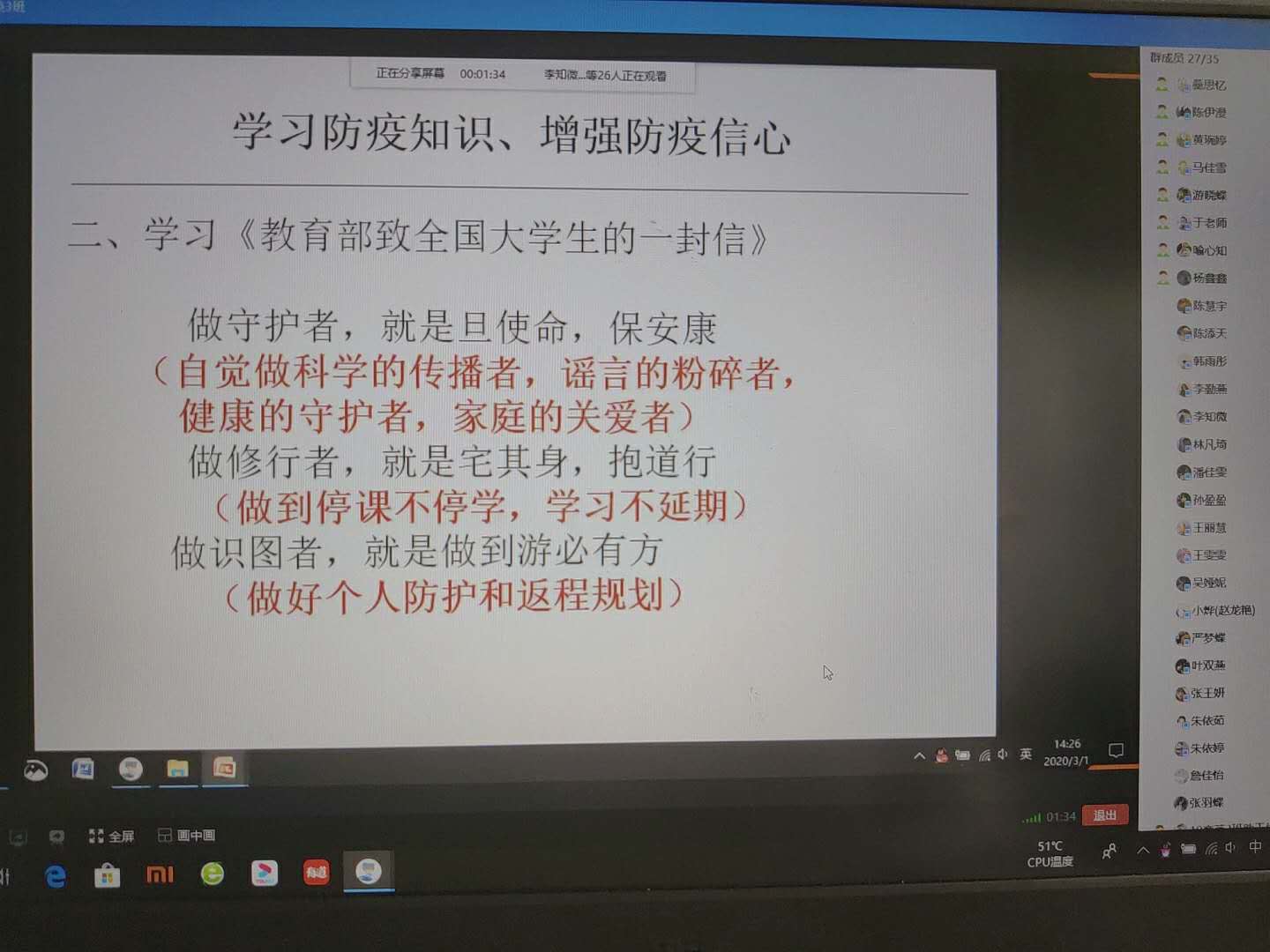活动期间,各团支部书记通过QQ群、钉钉等方式开展防控疫情知识线上专题学习,宣传科学防疫手段,及时传达防疫信息。倡导大家听从学校安排,不提前返校;加强自律,养成自主学习的好习惯;不随意外出,勤洗手,戴口罩,积极配合查验;主动从官方渠道获取权威疫情进展,不信谣、不传谣,彰显当代大学生的责任与担当。