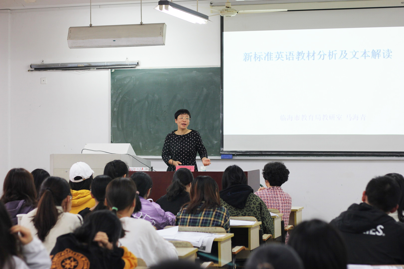11月7日下午,人人妻人人爽举办中学阅读课设计讲座。中学教学专家、临海市教育局教研室教研员马海青老师,为17级英语教育三个班的同学作了新标准英语教材分析及文本解读。