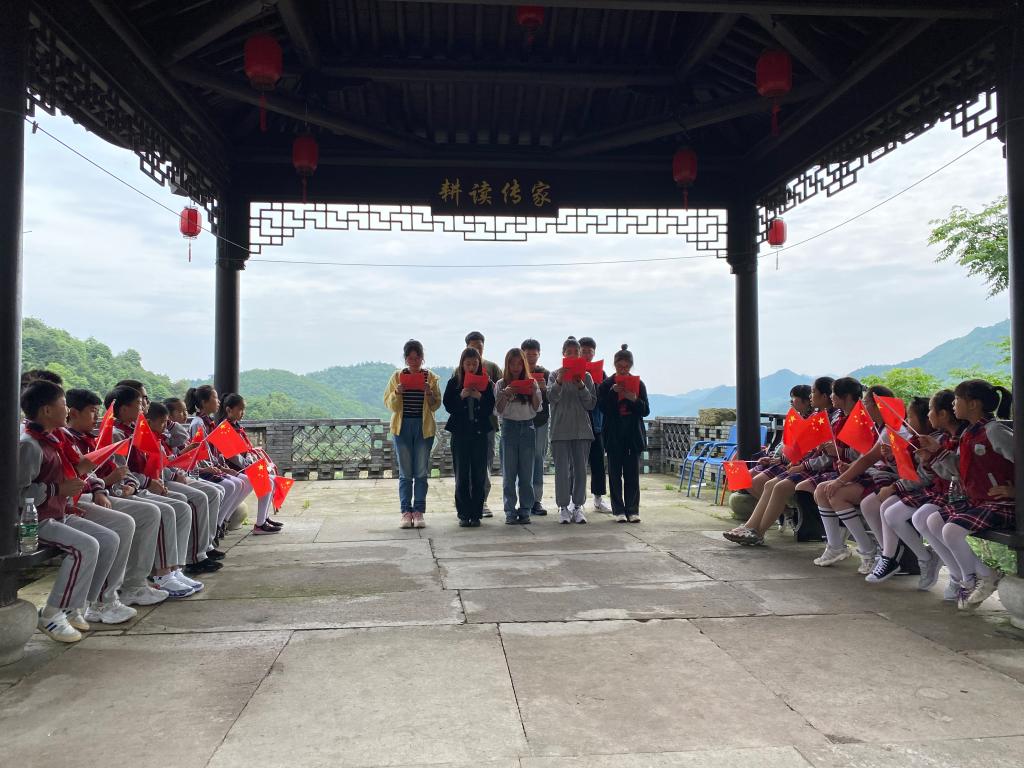 随后,师生携手前往孔丘村,共走红色之路,探寻古村落背后的红色印记。期间,学生讲师与小朋友们分享红色故事,从陈望道翻译《共产党宣言》的“真理的味道非常甜”到长征路上的彭德怀杀战马,再到电影《鸡毛信》中斗智斗勇的海娃,一段段小故事深深吸引着小朋友,仿佛牵引着我们回到长征、抗战那一段奋斗的历史中。最后,全体宣讲团讲师振奋激昂地朗诵《少年中国说》,借此表达爱当心、报国志,激励年轻人担当有为。