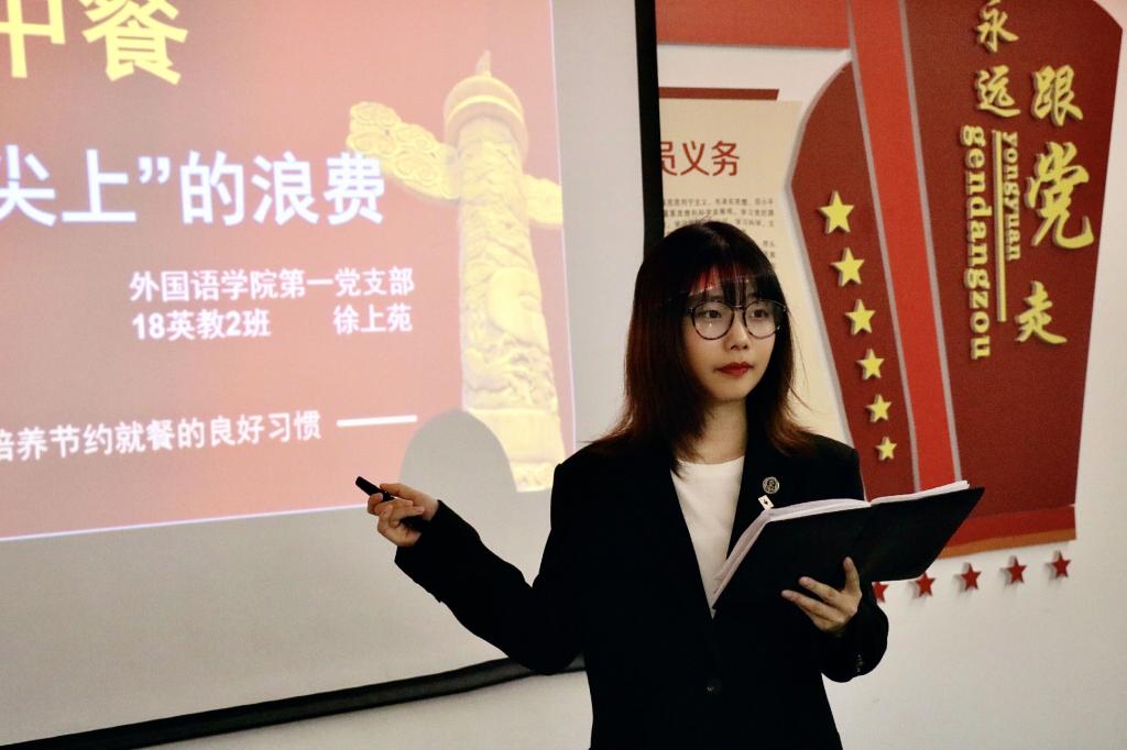 18英教2班预备党员徐上苑以“珍惜盘中餐,拒绝舌尖上的浪费”为主题,从光盘行动的意义、校园常见的浪费现象、创新服务和杜绝浪费的建议四个方面进行讲述。徐上苑从“粮食安全是治国理政重要内容、节约资源是生态文明建设的战略基础”解析了勤俭节约的意义,列举了校园内常见的浪费行为的让同学们更清晰明知道粮食浪费现象的普遍性和严重性并分享了各地开展的节约的创新举措。