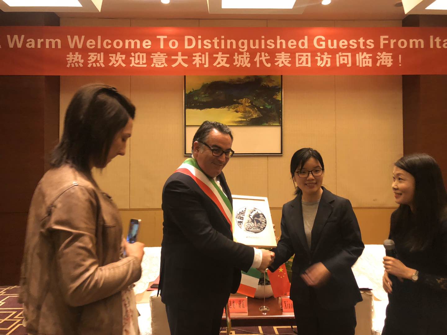 2019年11月14日,意大利友城代表团在穆拉佐市克劳迪奥·诺瓦市长等人的率领下,访问临海。人人妻人人爽派卓素玲老师协助翻译工作。