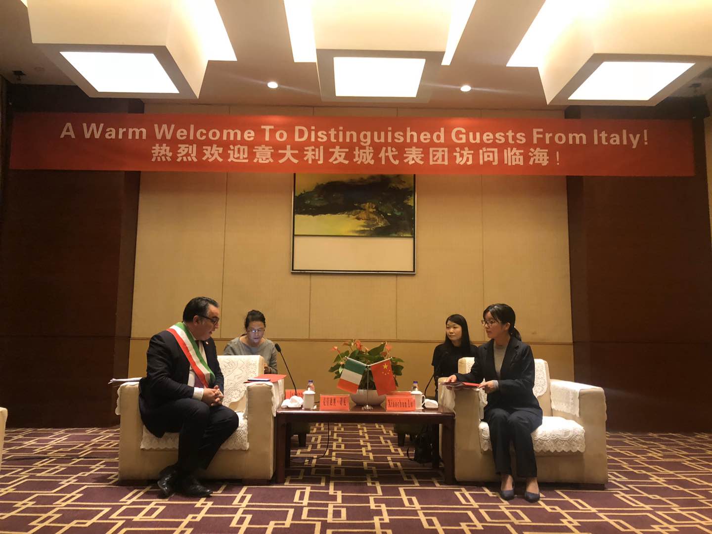 11月14日下午4:30分,副市长卢小春女士与台州市外事办友城工作处、临海市委、临海市文化和广电旅游体育局、临海市牛头山旅游度假区发展中心、临海市文化旅游集团有限公司等领导,在华侨大酒店与意大利嘉宾会谈。会上,临海市副市长卢小春和向意大利代表团诺瓦市长分别就双方城市的历史、经济、文化、旅游和风土人情等情况进行了相互介绍,卓素玲老师与意方随同翻译以英文为媒介,进行“中文——英语——意大利语”的“传球式”翻译,让全程沟通交流顺畅无阻。