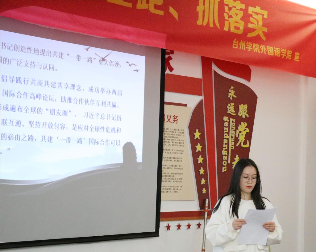 18英语1班预备党员吴鑫磊以“推动共建‘一带一路’走深走实”为主题,从打造一条跨越太平洋的合作之路、加强战略和行动对接,携手推进“一带一路”建设、共同绘制好“一带一路”的“工笔画”、推动共建“一带一路”高质量发展四个方面展开讲述。吴鑫磊从这四个方面出发,阐述了促进互联互通、坚持开放包容,是应对全球性危机和实现长远发展的必由之路,共建‘一带一路’国际合作可以发挥重要作用,“一带一路”顺应经济全球化的历史潮流、顺应全球治理体系变革的时代要求、顺应各国人民过上更好日子的强烈愿望。最后让同学们感受到,共建“一带一路”不仅为世界各国发展提供了新机遇,也为中国开放发展开辟了新天地。