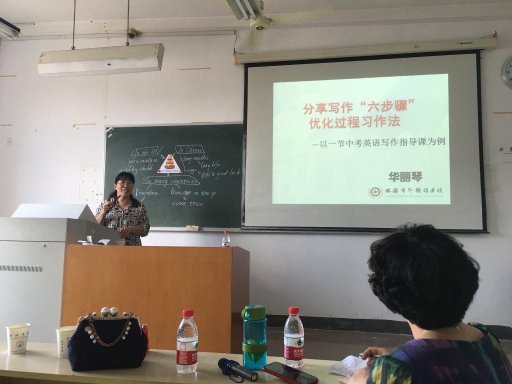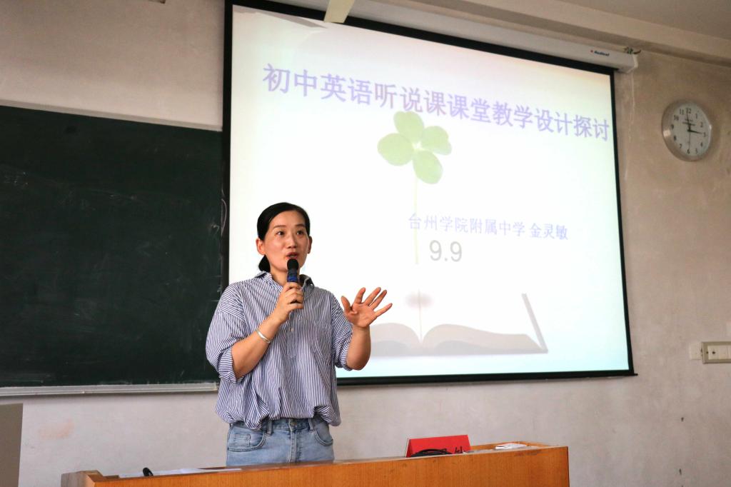 活动由学生示范课、专家点评、专家课例三部分构成。在我院16级师范生示范课程后,台州学院附中名师金灵敏老师就其教师自身素质、课程内容、师生互动三个方面进行了相应点评与指导,并做了“听说教学设计”主题讲座。回浦中学任美琴老师对学生表现进行了点评与指导。她开展了“浅谈英语词汇/语法学习指导”主题讲座,通过大量教材内容,针对词汇和语法两方面提出了众多指导意见,提出了自身关于词汇语法教学的独到见解——“词汇与语法教学,没有定法,具体内容,具体学习对象,应该有相适应的方法”。临海外国语华丽琴老师就示范课进行点评,而后开展了“分享写作‘六步骤’优化过程习作法”主题讲座,通过中考写作标准向我们完美展示了“一审”、“二列”、“三加”、“四美”、“五查”、“留抄”的写作六步骤。