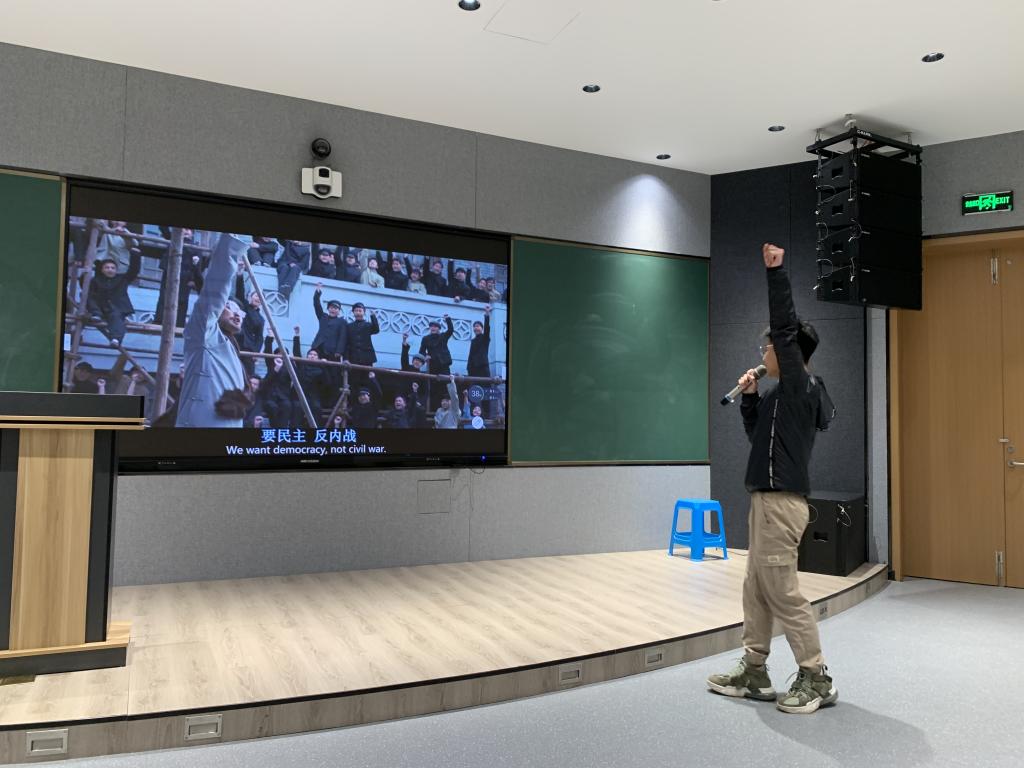 徐俊杰同学配音《建国大业》中李公朴遇害,闻一多激昂演讲的片段,他饱满的情感表现,感染了在场的每一个同学。大家深切地体会到中国共产党发展历程的艰辛与曲折,体会到当今美好生活的来之不易。