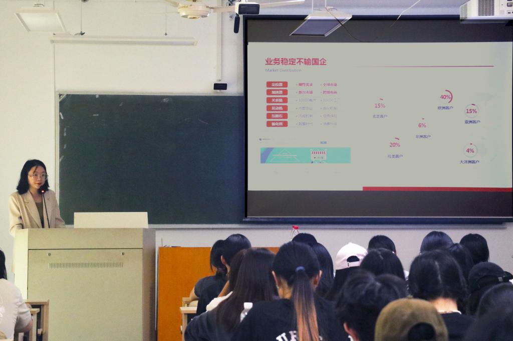 宣讲会伊始,余妙妙围绕赛尔集团的人才培养目标、外贸生态圈、集团内部稳定性、集团环境、发展前景等方面对公司进行了详细介绍。她强调,赛尔要培养的是具有企业家精神的优秀人才,是具有勇于承担社会责任的实干家。她以热情的口吻向同学们讲解赛尔集团独特的企业文化,着重强调了集团内部多彩的社团活动。