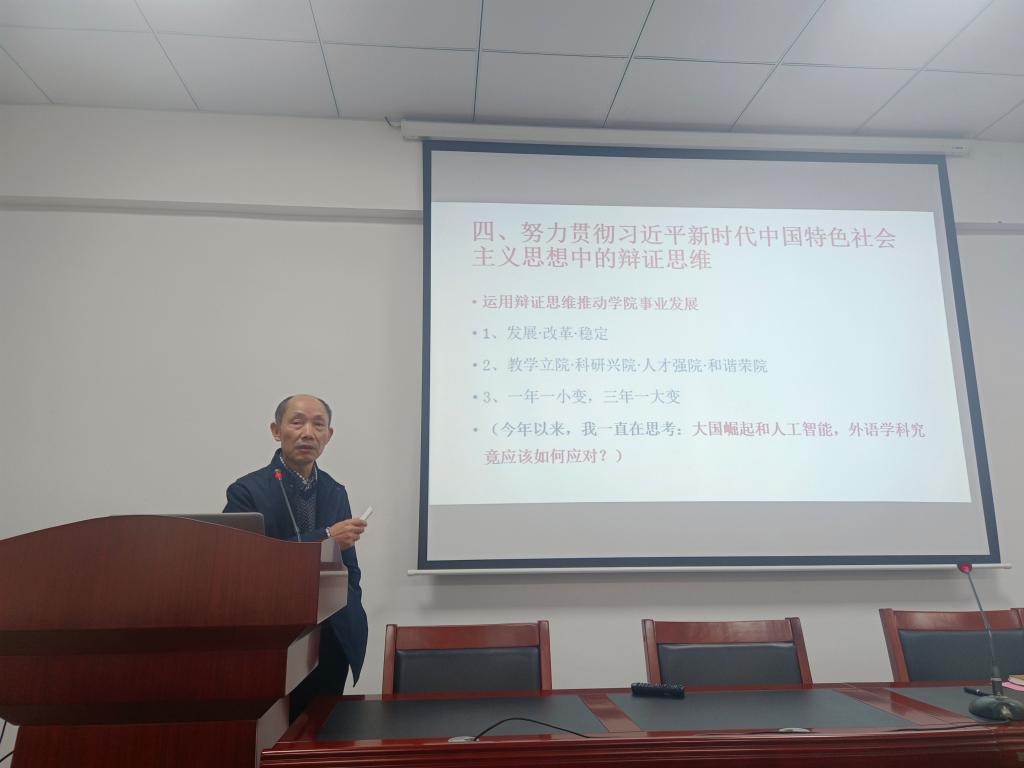 李涛以《习近平新时代中国特色社会主义思想中的辩证思维》为题,从习近平总书记论领导干部的思维、习近平总书记对辩证思维的强调、辩证思维如何贯穿习近平总书记治国理政的全过程和各方面等方面开展了论述,他强调学习习近平新时代中国特色社会主义思想,不仅要熟练掌握丰富的内容、重大的理念、重要的论断、基本的结论,更要准确把握新思想的世界观、方法论和贯穿其中的立场观点方法,并运用到认识问题、分析问题、开展工作中去。最后,李涛就如何运用辩证思维推动学院事业发展和促进个人事业发展对师生党员提出了要求。