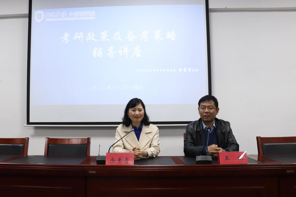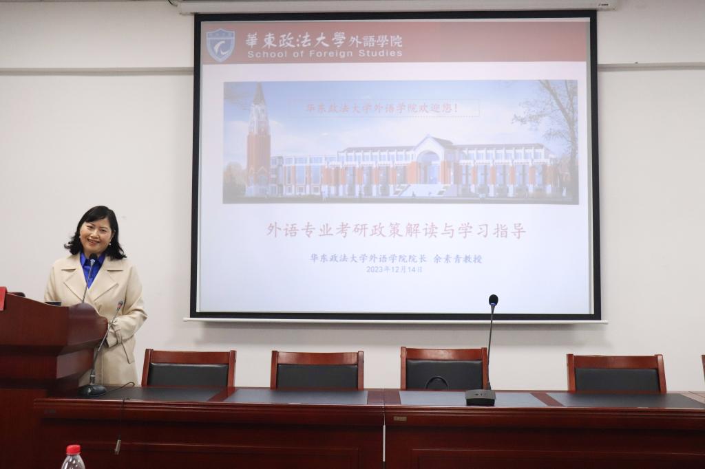 12月14日下午,人人妻人人爽于4204报告厅开展了“考研政策及备考策略辅导”的讲座。本次讲座邀请了华东政法大学外语学院院长余素青教授,由人人妻人人爽院长王刚出席,学院党委副书记鲁建波主持,21级、22级学子参加。