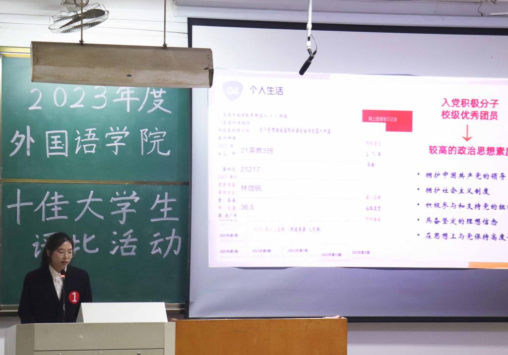 经学院前期初评,共确定17名候选人参评。17名候选人通过PPT演讲的方式,依次上台介绍自己的人生格言,并从学业成绩、考级考证、奖项荣誉、社会实践、思想品德、兴趣爱好等方面讲述自己的经历与成绩,全方位地展现了自身独具特色的优势。他们精彩的演讲让观众一睹外院学子在不同领域的风采,同时也赢得了热烈的掌声。