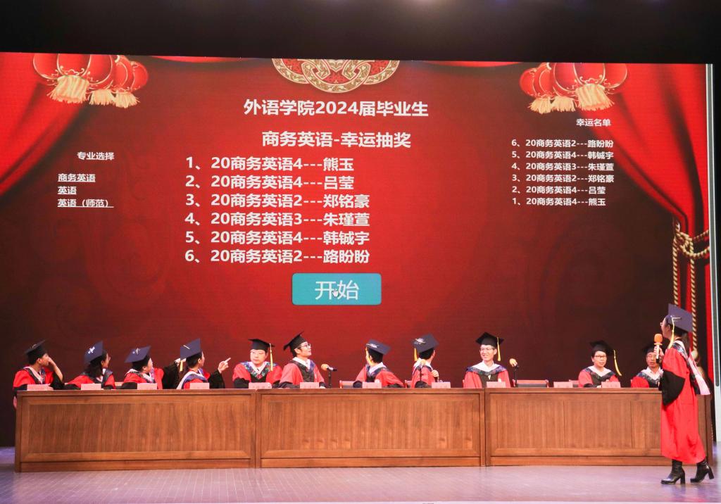 学士学位授予仪式中,学院领导和教师代表为陆续上台的毕业生依次拨穗,祝福毕业生学有所成、展翅翱翔。精心设置的抽奖环节由各位系主任亲自抽取幸运毕业生,送出由学院赠予的神秘礼物。