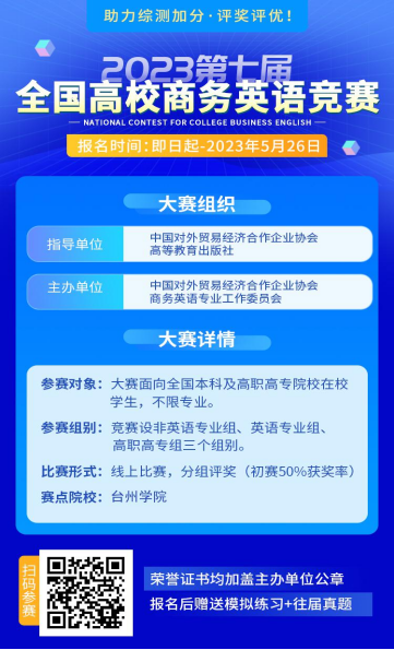 根据〔2023〕外经贸企协英字第1号文精神,第七届全国高校商务英语竞赛将于2023年5月至6月举行,具体时间安排为:2023年5月27日至28日进行初赛,6月3日至4日进行决赛。现将有关工作通知如下: