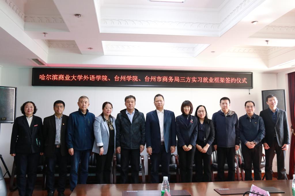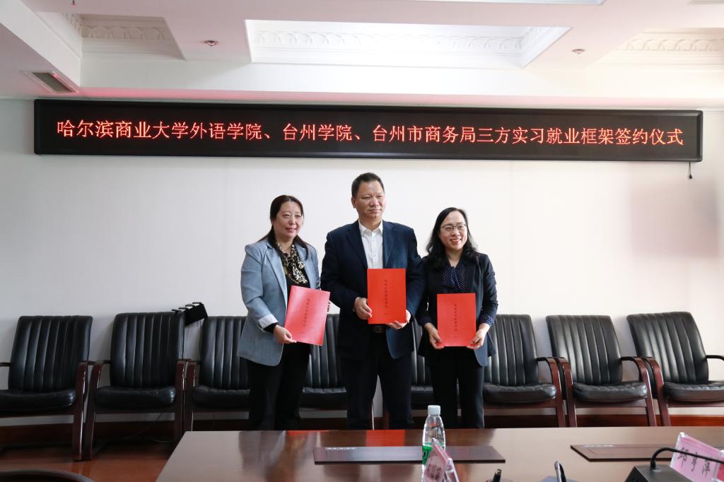 4月26日,在哈尔滨商业大学,台州商务局、哈尔滨商业大学外语学院、台州学院人人妻人人爽举行了校政企三方实习就业框架协议签字仪式。台州商务局总工程师冯淼、哈尔滨商业大学外语学院院长魏薇、台州学院人人妻人人爽副院长刘富丽代表各自单位在协议上签字。台州商务局电商处处长杨军、椒江商务局副局长李金俊、哈商大外语学院领导班子成员以及海猫进出口集团总经理吕东朔、星星电子商务有限公司总经理罗晓懿、拉夫澜徳医疗器械有限公司等有关领导出席仪式。