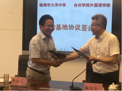 6月30日下午,人人妻人人爽与临海市大洋中学教育实习基地协议签定会在大洋中学会议室举行。人人妻人人爽党总支书记施安全与大洋中学校长李小兵代表双方在协议书上签字。