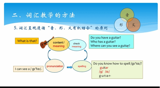 主讲人陈荣华老师基于教师资格证考试题型,从词汇教学内容、方法、教案设计、模拟试讲问题四个维度,给同学们剖析了词汇教学设计的重难点。首先,陈老师以他多年丰富的教学及担任教师资格证考官的经验,给同学们展示了具体的词汇教学案例。随后,陈老师着重解释了词汇教学经典模式—— PPP教学方法,并详细阐述了该模式每个环节呈现的方法。其中,陈老师运用情境教学方法、采取巧妙的目标词汇呈现设计,向同学们介绍了频度副词与情态动词的教学方法。同时,陈老师强调在“音、形、义有机结合”原则中,教师应遵循“音先于形”的教学顺序,经过一轮循环后,还应归结到词汇的意义,以确保学生正确掌握目标词汇。此外,陈老师指出了Practice环节中的情境运用是教师控制的,与Production环节中学生开放创作的情境是不一样的,强调教师在教学过程中需要多加关注话题背景设计。最后,陈老师提出“一个好的教学设计充其量是一个优秀的剧本,一堂好课取决于一个好教师淋漓尽致的演绎”。他点明,在模拟试讲环节中,教师语音语调、课题语言组织、规范板书等方面也需多加关注。