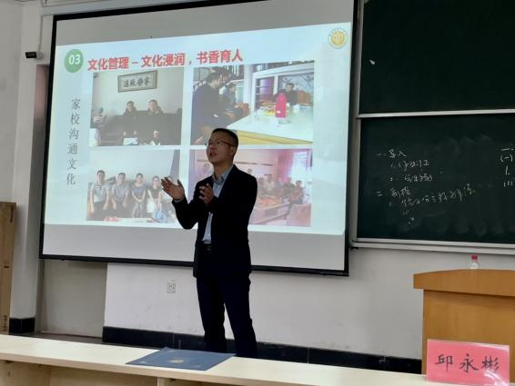 台州市第一中学副校长邱永彬受邀为同学们作了题为“做一名幸福的班主任”讲座。他从制度管理、情感管理以及文化管理三方面入手,介绍班主任工作经验。制度管理方面,应制定详细的班级考核规则,明确班干部的职责分工,保证班级里“人人有事做,事事有人做”。情感管理方面,班主任要心中有大爱,对学生进行感恩教育。文化管理方面,可以通过带领学生设计班徽、班旗以及班刊,形成班级特色文化,以文化浸润,以书香育人。邱老师以自己的实际经历与体验展示了班主任在学生成长过程中的重要作用,分享了他与学生相处的点滴,展现了学生对他的关心与感谢,体现其真正实现了“做一名幸福的班主任”。