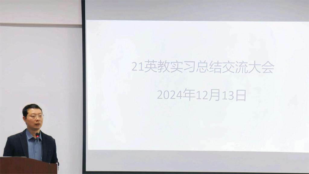 首先,马俊周对实习成果作简单介绍,表示实习生在工作中认真负责,他们的表现得到实习学校师生的肯定,随后他请六个小组代表依次上台分享。大洋中学实习小组代表金美惠分别从见面会和学校概况、教学工作、班主任工作、学校活动四个方面进行介绍,并着重讲解了备课流程和上课的注意事项;台州学院附属中学实习小组代表陈祎彤分享了实习概况、班主任工作、教学工作三方面的内容,并建议积极参与学校的大型教学研讨会,主动向实习学校老师请教和沟通,增加备课教学经验;椒江区第五中学实习小组代表吴爱珂用图片生动形象地展现了实习生活的丰富多彩,强调在上课时提醒同学做笔记以及课堂纪律管理的重要性。临海市外国语学校实习小组代表周冰从学校设施、学校制度和活动、学校师生、实习安排四个方面展开,强调了备课应深入挖掘文本,改作业应给予学生积极正向反馈,以调动学生学习热情。临海市第五中学实习小组代表朱丽玲分别介绍了学校概况、教学设施和日常生活,同时指出要注重指导老师的课后点评以及与指导老师沟通交流的重要性。台州学院附属学校实习小组代表李嘉仪在实习收获中提到因材施教,上课时应准确把握重难点,课堂指令简洁明了,对待学生宽严相济。最后,马俊周主任总结了实习中的问题与不足,希望同学们做一个有大格局、有教育情怀的人,并对22级学生未来的实习生活提出展望。